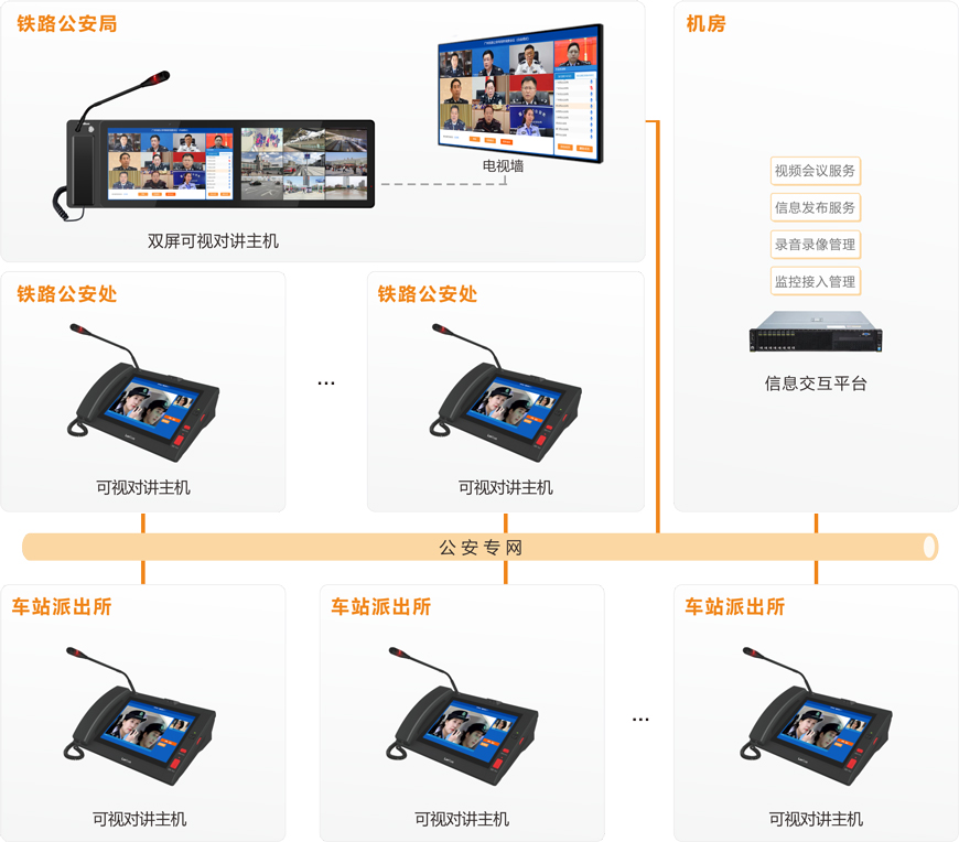 铁路公安部门工作所涉及的范围越来越广,执法工作量日益增加,公众对铁路公安部门的工作效率、反应及应变能力等提出了更高的要求。同时,各机关之间地理跨度较远,日常勤务沟通较频繁,需建立一套“局--处--所”三级架构互联互通的“音视讯”通讯指挥系统,实现及时便捷的沟通交流,提升铁路公安局、铁路公安处、车站派出所之间日常沟通效率和应急处置能力。