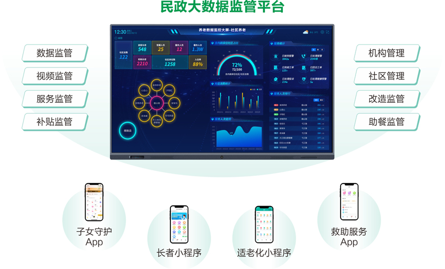 民政办 公室 | 民政监管数据 机构养老管理 社区养老管理 家庭床位管理 长者基础档案 助餐监管 改造管理 呼叫中心 信息发布 项目管理 | / | 套 | 1 | 含云服务(B/S架构), 支持多级架构。 |